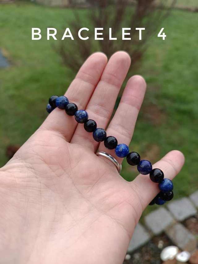 Bracelet 4 : Lapis lazuli, Onyx. Vertus : protège des énergies négatives, protège, intuition, créativité, anti stress et calme les angoisses