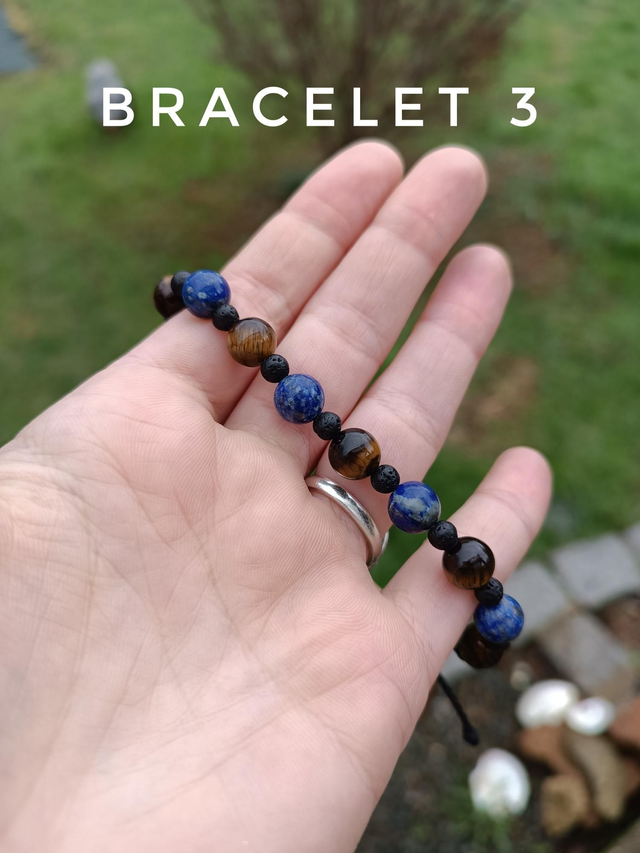 Bracelet 3 : Lapis lazuli, Oeil de tigre, Pierre de Lave. Vertus : Intuition, créativité, anti stress et calme les angoisses, protection, ondes positives