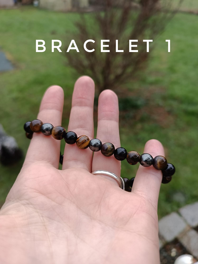 Bracelet 1 : Onyx, Oeil de tigre, Hématite. Vertus : Protection, ondes positives, énergie et vitalité