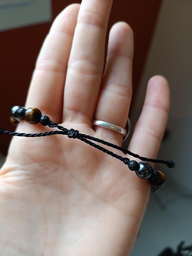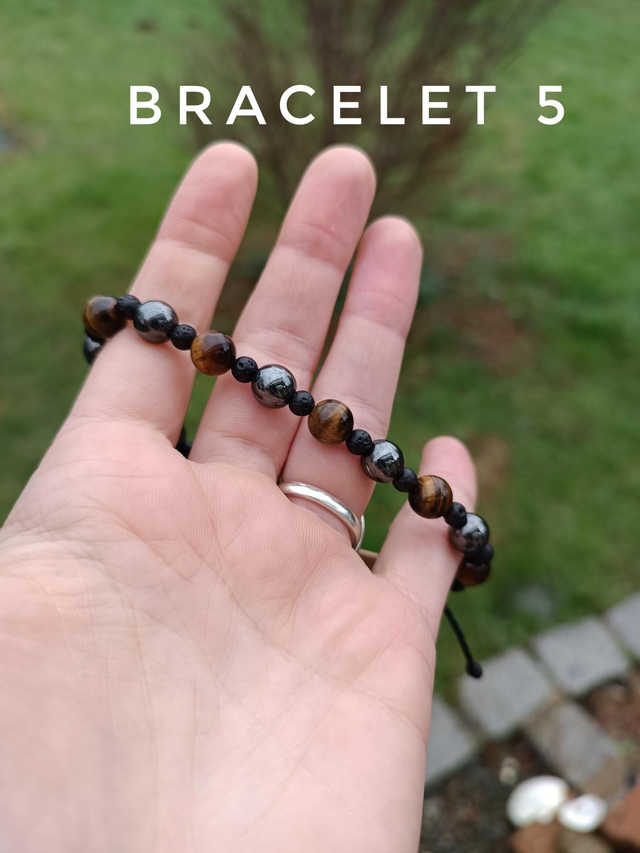 Bracelet 5 : Hématite, Oeil de tigre, Pierre de lave. Vertus : Protection, ondes positives, énergie et vitalité